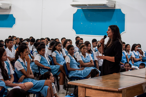 Laura Silva Roldán talks to a group of students in northern Colombia.